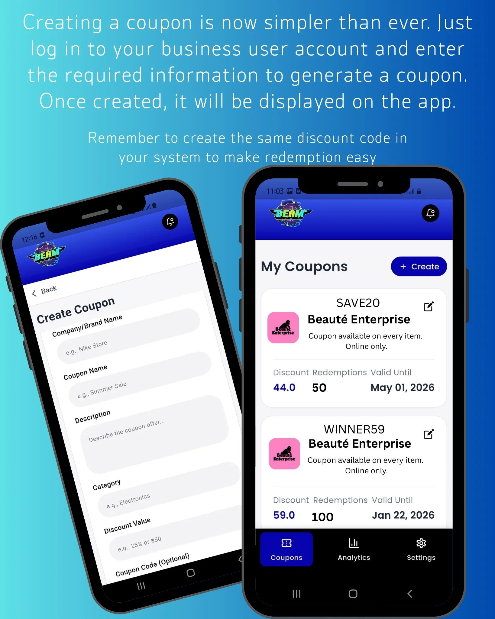 Download the app in the App Store or Play Store, create your business account, select your monthly plan then you’re all set. You can then create your coupons.