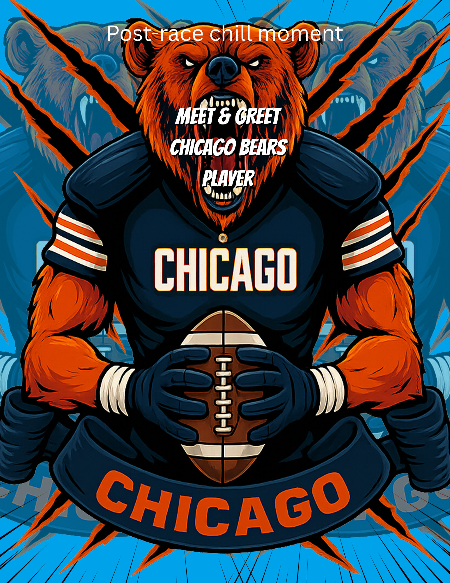 After the race, you will be redirected to a private location to meet and take pictures with a Chicago Bears player. Limited spots. Register Now!